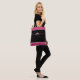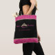 This tote bag is shown in faux hot pink and gold colored glitter band at top and bottom with black strap handles. Black bag and on both sides is an attractive crown with faux hot pink color stones. Text reads " Future Miss Rodeo in training".