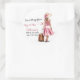 The sticker is made on wonderful paper and had no problem sticking to the bag that I purchased to put it on. I wanted to find a design that would be cute for the bride and groom and this one fit the bill as it has cute "bees" buzzing around and the wedding was taking place in a town called "Bee Cave". The packaging was great and protected the stickers. The website is easy to navigate and there are so many color choices. I had no problem finding a color that the bride was using on everything else selected. The design was adorable and there were many to choose from. You can make the figure as larger or smaller and you can place the photo and writting whereever you want to in the sticker. The printing is fabulous..better than expected.