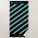 This beach towel is shown in a Black background with bold Aqua color stripes and with a print of a gleaming Silver pageant crown. Has sample text for you to personalize with your own name or title.