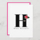 This lovely flat style note card has a big, bold monogram in the middle. Inside of the monogram is a silver-tone crown image and along the side of the monogram is a two tone rose similar to double delight rose. Your last or first name beneath the monogram. Backside has colorful border of rose hot pink. Custom text for you to personalize is shown in "H" and