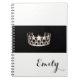 Notebook shown with a photo print of a gleaming Silver colored crown print on a black background and a personalized name. Notebook shown in White, but choose your color of background. Customize this item and change the name to yours or take off, or purchase as shown.