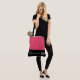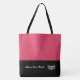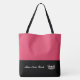 This cute stylish large tote bag is shown in a Geranium Pink and Black color block style with a pageant crown and custom text.