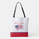 This cute stylish medium tote bag is shown in White with a pageant crown and personalized text over an American Flag on an angle. Has bottom strip of Red with Royal/Navy Blue thinner stripe.