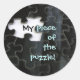Slap this whimsical sticker on mail or other property. This round sticker sports a close-up photograph on a blue streaked black segment of a jigsaw puzzle exposing one missing piece. A concept design for individualism, independence, the missing puzzle piece or whatever you'd like. Under "Personalize it" fill in the template fields, remove text completely or click "Customize it!" to select a font style, size and color you prefer. Under #2 Select your style and size choose the alternative 3" size.