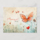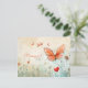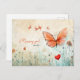 A simple watercolor painted postcard that features spring flowers, butterflies and a red heart all in muted pastel colors.