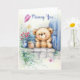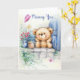 Cute bear thinking and watching a butterfly at window with flower pots besides, Missing You.