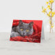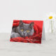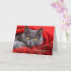 A cute British Shorthair gray cat is snuggled up in a cozy red knit afghan blanket on this sweet missing you card for the cat lover.