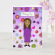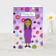 I Miss You Friendship card. Pretty purple flowers and a lady with black hair drawn in a folksy way.