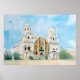 A watercolor painting of Mission San Xavier del Bac in Tucson, Arizona.