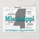 Mississippi state pride image including map silhouette with cities, towns and nickname.