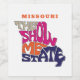 Fun and colorful typographic design with a retro feel features the state of Missouri's nickname: The Show Me State displayed within a state shaped silhouette