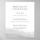Designed to match our Mist wedding collection, this elegant sign is perfect for placing at the bar to share your specialty cocktail creations with guests. Personalize the header and and six text fields over a sheer wash of pale gray watercolor.