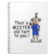 Humorous birthday attitude T-shirts, buttons, mugs, magnets, keychains, cards, stickers, and other birthday apparel and gifts featuring Gus with a birthday hat dressed in his robe and slippers saying "That's MISTER old fart to you!".
