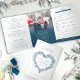 White and blue mistletoe hand-drawn botanical art wedding all-in-one invitation with two photos and a full meal options RSVP. Personalize this detachable reply wedding invitation with your own wedding ceremony details, schedule, accommodation, and other information as well as three-course meal options replies, and two of your favorite photos one in the inside center and one on the back. winter mistletoe hand-drawn design ideal for a winter wedding. Other colors and matching wedding items are available. © Original drawing and design by Sarah Trett for www.mylittleedenweddings.com on Zazzle.