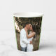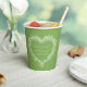 Mistletoe heart wreath drawing green and white winter wedding party paper cups with your own photo on the reverse. Add your own couples name and wedding date on a green background with white mistletoe heart wreath and white text on one side and photo on the other side. Other colors and matching wedding items available. © Original drawing and design by Sarah Trett for www.mylittleedenweddings.com on Zazzle.