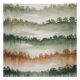 A serene and atmospheric watercolor painting depicting rolling hills and forested landscapes shrouded in mist. The artwork uses a soft palette of greens, browns, and muted earth tones, with layered washes creating a sense of depth and distance. The brushstrokes evoke the texture of trees and foliage, giving the impression of a peaceful, fog-laden forest.