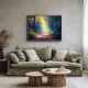 This painting portrays a mystical forest trail bathed in the soft glow of dawn. Sunlight filters through the dense canopy, casting golden beams onto the path, which is surrounded by lush foliage in shades of green, yellow, and purple. A light mist lingers in the air, adding a dreamy, ethereal quality to the scene. The interplay of light and shadow creates a sense of wonder and tranquility, inviting the viewer to step into this enchanted woodland retreat.