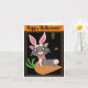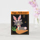 Misty's a gray cartoon cat in an adorable pink bunny costume, complete with rabbit ears and tail. She's sitting on a carrot cushion that's placed in front of a dark haunted house with a few lights, and a brown owl is perched on it. Trick or Treat! The background can be any color.