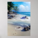 Beautiful watercolor illustration of a misty tropical beach scene with palm trees, rocks, waves ad blue cloudy skies. An AI created fantasy digital art print.