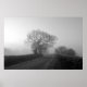 Mist hangs over a frosted rural landscape - oak trees, hawthorn hedges, a country lane and an old barn - in Cheshire, England.