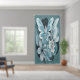 A serene arrangement of soft blue and white silk flowers accented with gentle touches of green. Painted in light cyan, slate grey, soft moss, and powder blue, the piece radiates a cool, tranquil elegance with a refined simplicity.