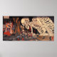 This is another color print by the famous Japanese artist Utagawa Kuniyoshi (19th Century). This Japanese print is titled: Mitsukuni defying the skeleton specter invoked by princess Takiyasha". In the print we can see the princess reading out the spell from a scroll, while Mitsukuni the warrior is drawing his katana (sword) from its scabbard in order to fight the giant skeleton that has appeared. Quite a scary situation to be in! This large print is actually made up of three smaller ones. The Japanese artist has signed each one of them in Kanji characters and Hiragana (Japanese writing).