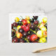 Colourful postcard with a photograph of dark sweet cherries and yellow blushing bing cherries.