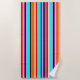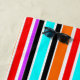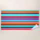This beach towel has a simple design of vertical stripes of varying thicknesses in red, orange, purple, black, light blue, and white.