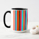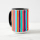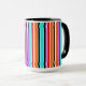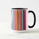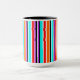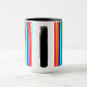 This mug has a simple design of vertical stripes of varying thicknesses in red, orange, purple, black, light blue, and white.