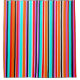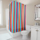This shower curtain has a simple design of vertical stripes of varying thicknesses in red, orange, purple, black, light blue, and white.