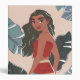 A beautiful illustrated moment with Moana looking back through the tropical leaves.