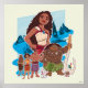 This colorful and detailed graphic celebrates the beloved characters from the animated world of Moana. It features Moana at the forefront, standing proud and determined, her paddle in hand. Beside her, the mighty demigod Maui, equipped with his magical fishhook, exudes strength and confidence. Accompanying them are Moana’s vibrant and supportive crew: Kele, Loto, Moni, as well as their quirky animal companions—the loyal pig Pua and rooster Heihei. Set against a backdrop of their island and the vast ocean, this image captures the essence of adventure and the unyielding call of the ancestors.