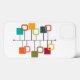 This phone case has a mid-century modern design that looks like a mobile with solid and open squares hanging from it in teal, orange, green, red, and beige.