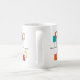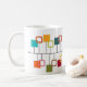 This mug has a mid-century modern design that looks like a mobile with solid and open squares hanging from it in teal, orange, green, red, and beige.