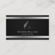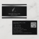 Stylish silver and black mobile notary business card has a silver quill on a black suble striped background with silver foil bars. Add your notary business details and QR code on the back.
