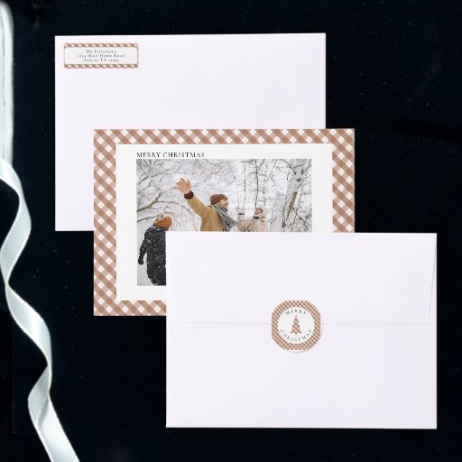 Mocha Chocolate Brown Gingham Two Photo Christmas Holiday Card