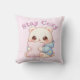 Mochi Cuddle Bear Pillow featuring a cute kawaii character with big glossy eyes hugging a pillow. Perfect cozy gift for kawaii and bear lovers.