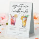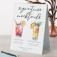 This chic signature mocktails menu table tent sign features simple black tyopgraphy above 2 cute drinks and their ingredients for your wedding bar. A Shirley Temple and non-alcoholic virgin Piña Colada add a cool flair to your bar menu. Complete with the couple's names and date for their reception.