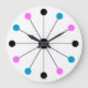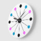 A retro wall clock with an Atomic Age Retro 1950s theme, with black spokes and circles in teal, pink and black, no numbers. For your vintage themed room, bedroom or spaceship.