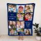 Navy blue photo collage fleece blanket to display and enjoy 10 of your favorite pictures of family, friends, grandchildren, pets, memories, etc. Add two sections of your custom text in modern white typography.