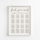 Simple and modern light cream downloadable wedding seating chart poster for up to 16 tables featuring "find your seat" in a chic script and your names and wedding date joined together by a heart. Select the digital download option to edit with last minute changes and print locally.