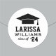 Custom round graduation party stickers features a black and white design (can be modified via "Customize It!") with a graduation cap and custom text for the grad's name and class year.