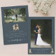 Make your wedding unforgettable with this two photo funny dinosaur-themed thank you card, featuring a whimsical T-Rex bride and groom set on a stylish charcoal gray background, this unique design combines playful dinosaur art with modern elegant wedding style perfect for couples who want to say thank you in a fun and unforgettable way.