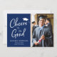 Modern 2 photo graduation announcement card. On the front, your graduate's photo is next to "Cheers to the Grad" written in a modern white script with a grad cap on top against a navy blue background. Easily personalize with your graduate's name and school, and add another photo on the back.
