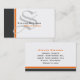 A white background with a large charcoal colored stripe and a smaller orange colored stripe on the left hand side of the card. In the center of the card is a large initial in soft gray. Your name and title is on the front and all other information is on the back.