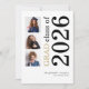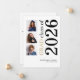 Modern 3 photo 2026 White Graduation Announcement. A stylish bold typography and multi photo design, with large text rotated and to the right hand side in black and gold. Easily to personalise the text on each side and replace the photos in the templates with your own of square orientation.