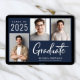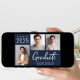 Modern dark navy blue graduation announcement featuring 3 photos and "Graduate" in a contemporary bold white script. Add the grad's name, class year and school or university in simple white typography.