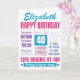 A modern typography 40th birthday card in pink, purple and blue. This fabulous card can be personalized with the name of the fortieth birthday recipient. It contains several birthday quotes including 'life begins at 40' and 40 years loved'.