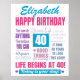 A modern typography 40th birthday poster in pink, purple and blue. This fabulous party decor can be personalized with the name of the fortieth birthday recipient. It contains several birthday quotes including 'life begins at 40' and 40 years loved'. A stylish addition to a 40th party!