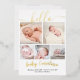 A modern, simple and elegant white baby girl birth announcement with 5 photo grid collage, and an elegant typography calligraphy, with hello baby name. Introducing baby with real gold foil.